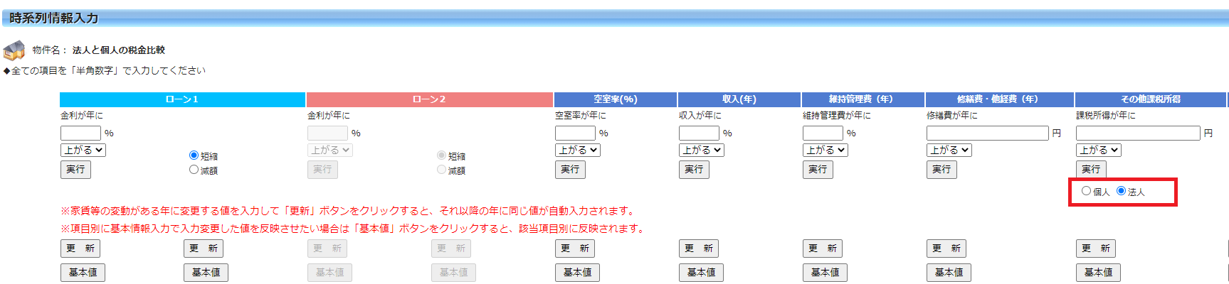 アセットランクシミュレーター時系列情報画面の個人法人切り替え