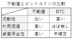 不動産とビットコインの特徴の比較表