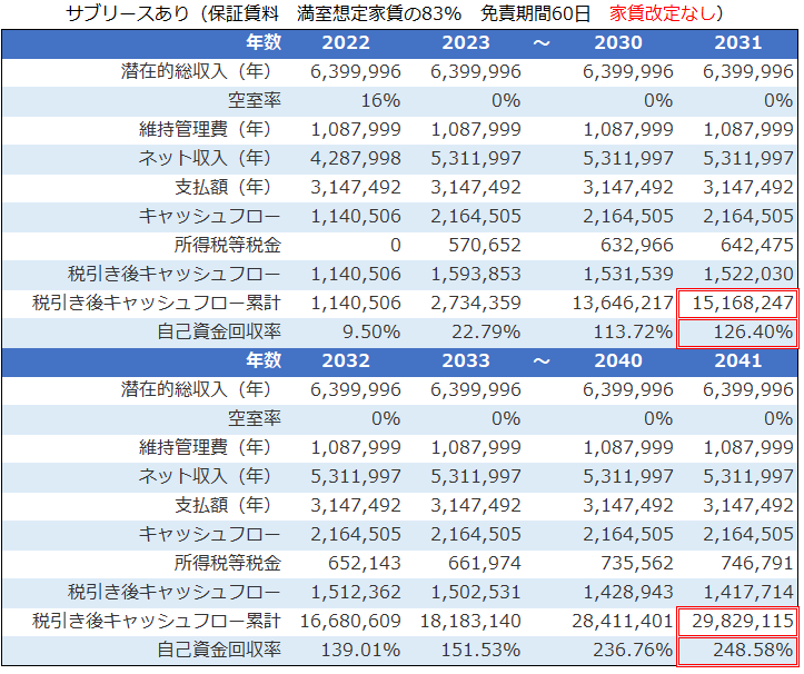 不動産投資シミュレーション結果サブリース契約あり家賃改定なし