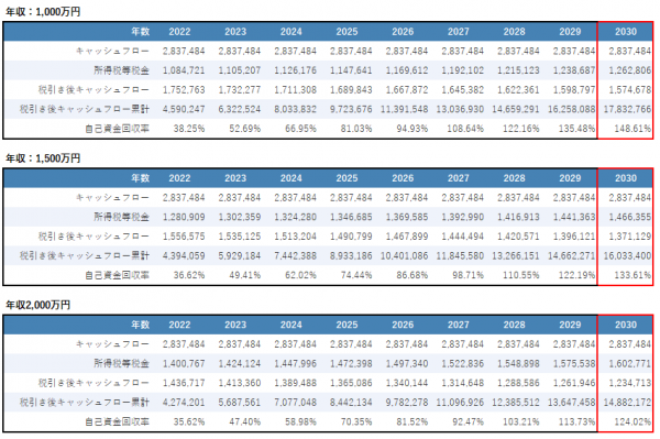 年収による不動産投資成績の比較表